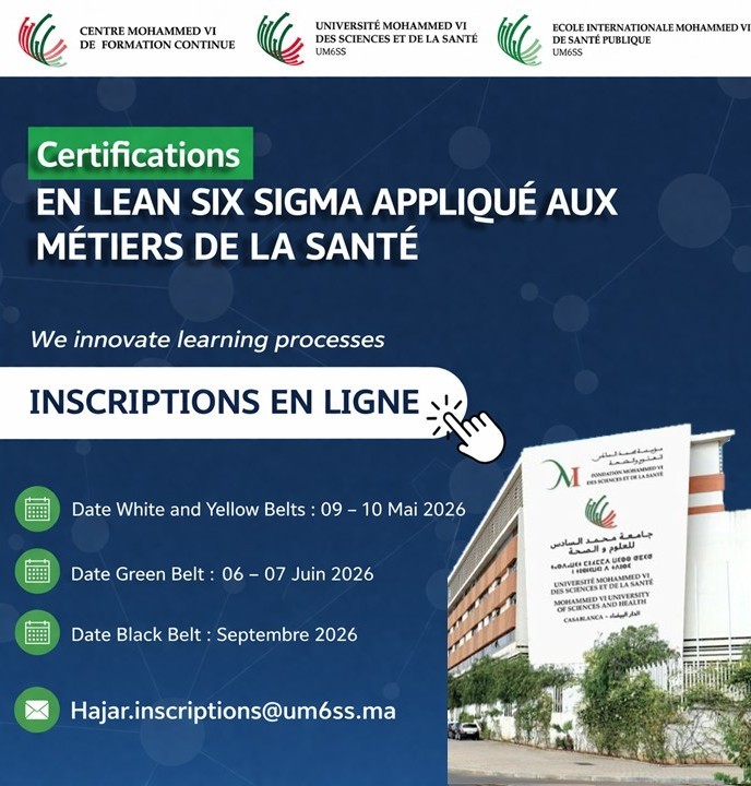 NB : Les personnes ayant complétées les niveaux de certification Lean Six Sigma (Ceintures Blanche/Jaune, Verte) et validées la présente ceinture noire pourront obtenir un Diplôme Universitaire en Lean Six Sigma délivré par l’UM6SS.