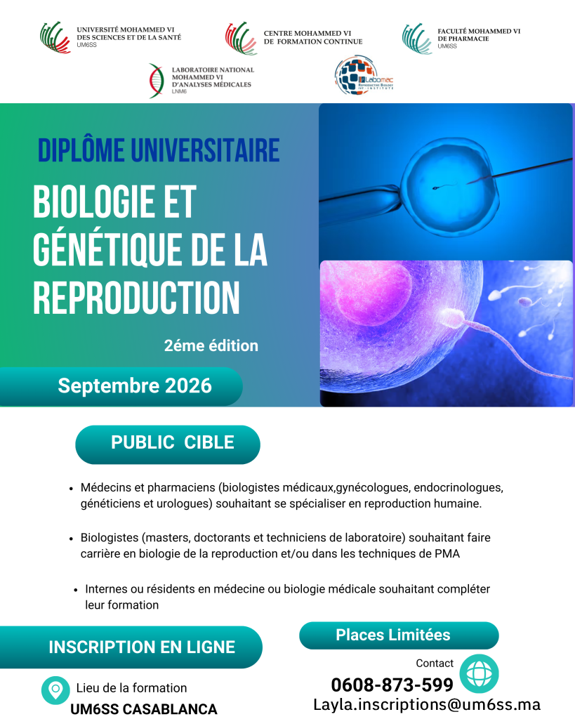 La Faculté Mohammed VI de Pharmacie en collaboration avec la Faculté Mohammed VI de Médecine de Casablanca, en partenariat avec Labomac et IRIFIV organise le Diplôme Universitaire en Biologie et Génétique de la Reproduction